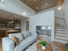 木の天井が温かみを添える、明るい中二階スペース。高すぎ天井を活用した壁沿いの長いカウンターデスクでテレワークや趣味を楽しめます。リビングを見下ろせる設計で、家族とのつながりも大切に。屋内遊び場