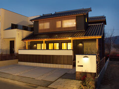 夜の静寂に溶け込む住宅の外観。暖かい光が窓から漏れ、伝統的な和風のデザインが温かみのある雰囲気を醸し出している。この住宅は、日本の伝統美と現代の利便性を融合したナチュラルな住まいである。リビングには通り土間が特徴的で、畳のスペースが和の趣を添えている。大きな窓から自然光が差し込み、家族が集う広々とした明るい空間を作り出している。吹き抜けのリビングでは、ナチュラルな木材の温かさが心を和ませ、リラックスできる。ダイニングはシンプルながらも木のぬくもりに溢れ、家での食事をより豊かな時間にする。外観は、木の屋根と銅樋が絶妙に調和した和モダンな佇まいで、訪れる人々を魅了する。建築家が手がけたこの家は、機能性とデザイン性を兼ね備えた完全自由設計の木造住宅である。