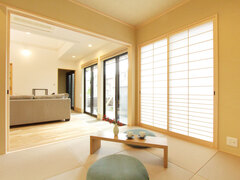 シンプルで洗練された和室。障子から入る柔らかな光が心地よく、訪れる人に落ち着きを与える空間となっている。リビング