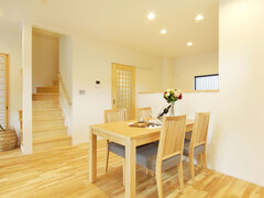 シンプルで明るいダイニング。木製のテーブルと椅子が温かみを感じさせ、家族での食事に最適な空間を作り出している。キッチン