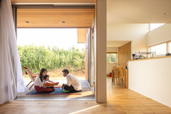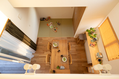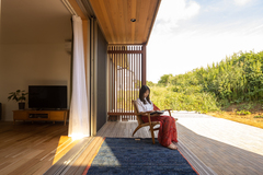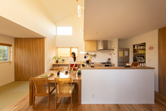 リビングから続くウッドデッキ。暖かい日差しが差し込み、自然を感じながらリラックスできるスペースとなっている。自然に囲まれた二階建てのこの家は、暖かい色合いの外壁が周囲の景観と見事に調和し、落ち着いた雰囲気を生み出している。家の中に入ると、ダイニングには木製のテーブルと椅子が配置され、明るい窓から差し込む自然光が心地よく広がる。隣り合う畳スペースは家族が寛ぐことのできる理想的な空間である。キッチンはウッド調のインテリアを取り入れ、家事をしながらも家族との会話を楽しめるよう開放感が演出されている。さらに、リビングから続くウッドデッキは、暖かい日差しの中で自然を感じながらリラックスできるスペースとなっており、家族全員が心地よい時間を過ごすことができる。この家は完全自由設計で建築家が手掛けた、ナチュラルかつスタイリッシュな木造軸組工法の住宅である。