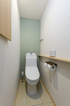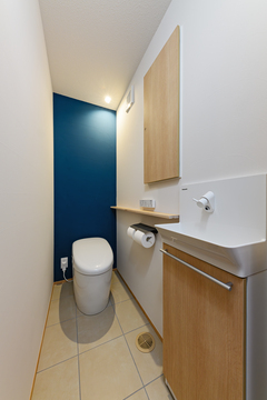 2つ目のトイレ。壁の色を一部変えてアクセントに。断熱等級7をクリアした高性能な平屋のお住まいです。