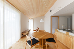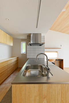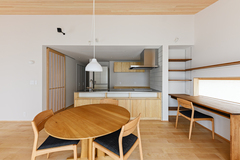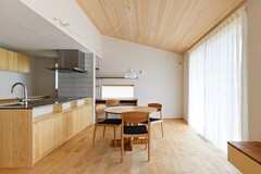 LDKは一番南に計画し、冬は太陽の暖かさををいっぱいに取り込む、パッシブな暮らしが可能です。リビングダイニングは勾配天井+板張りでダイナミックに。