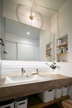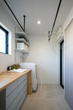 一面鏡でスタイリッシュに仕上げた洗面コーナー。ランドリールーム