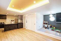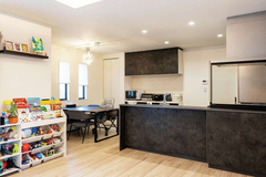 「家を建ててよかった。快適です」と笑顔のAさん夫妻。一番のお気に入りは、20畳のLDK。隣に小上がりの畳コーナーもあるリビングは、家族みんながゆったり集まれる憩いの場だ。折り上げ天井が高さと奥行きを生み、間接照明を組み合わせることでよりスタイリッシュな雰囲気に仕上がっている。キッチンは脱衣室、洗面室、玄関ホールとつながる回遊動線の一角に配置。「最短距離で家事ができて使いやすいです」と奥さま。子どもが小さいうちは畳コーナーを遊び場に。小学校へ上がってからは、帰宅時に必ず顔を合わせるようにとリビング階段を設置。丁寧なヒアリングと一級建築士による設計、確かな技術の施工により、暮らし&子育てのしやすさと、おしゃれなデザインを両立させた住まいを実現できた。住宅性能評価取得をはじめ、性能面も申し分ないのが、地域の人たちから信頼される理由だ。