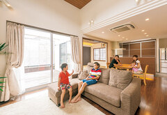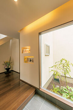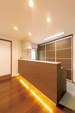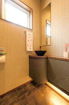 マイホームでやりたいことがたくさんあった奥さま。その希望をすべて叶えるだけなら、あるいは他の会社でもできたかもしれない。しかし『藤井建築事務所』は違っていた。お2人のご要望をベースに、さらに考え抜かれ、作り込まれたプラスアルファのデザインが多く、それがこの家を一段とブラッシュアップしているのだ。一つめは、暮らしやすく、家事がしやすい生活動線。二つめは、光と風を家の中に取り込みつつ、外部からの目線を考慮した開口部の取り方と、プライベートスペースがより広がる空間構成。三つめは、間接照明や造作家具などに見られるさりげないデザイン提案。打ち合わせや電話での相談も数えきれないほど回数を重ね、「私の希望を叶えようと、とにかく一生懸命にやってくれました。こちらが思いつかないような提案もあり、いい家を造りたいという藤井さんの気持ちが伝わってきました」と奥さま。住んでみて改めて、使い勝手の良さに感心しているそうだ。