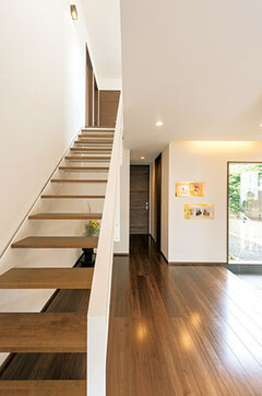 タイル、鉄骨、木と異素材を組み合わせ、シンプルながら存在感のある空間を作り上げています。またデザイン的なことだけでなく、太陽光発電や床暖房といった設備も、お施主さまのご要望を叶えられるようにトータルプロデュースしました。