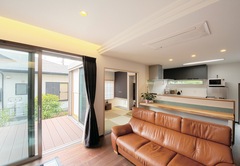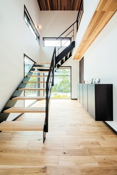 結婚を機に、実家を建て替えることになったWさんご夫妻だが、依頼先に迷いはなかったという。それは『藤井建築事務所』が手がけた以前の家の住み心地に満足していたから。一級建築士事務所ならではのデザインセンスと施工まで一貫して行う監理体制により、二世帯住宅となった新居も大満足の一棟となった。子世帯側の玄関ホールに待っているのは、庭の緑まで取り込んだ圧倒的な開放感。無垢に包まれた空間に架かる鉄骨階段が、軽やかな暮らしのリズムを生み出す。2階のポイントは、デッキを囲むコの字のレイアウト。実際以上の広さ、明るさとともに自然なつながりがもたらされることになった。共働きの奥さまが望んだ家事への配慮も十分だ。一方、1階はお母さまの「こうしたい」を実現。玄関スロープをはじめ、バリアフリーも徹底された。意匠性と快適性。木と鉄の素材感。そして子世帯の憧れと親世帯の安心。それらが絶妙に溶け合う住まいでの暮らしは、「次も」と思わせてくれるに違いない。