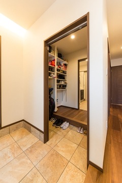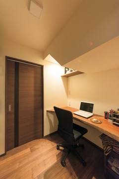 階段を中心に書斎を介して回遊できるようプランニング。玄関からシューズクロークを通って一直線にバスルームへ行けるようにするなど、家事動線に配慮。暮らしやすい家になりました。
