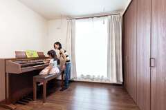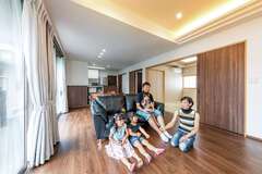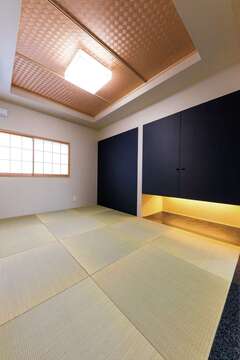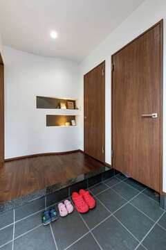 夫妻が家に求めたのは、洗練された空間ながら暮らしやすい家事動線。さらに、冷暖房効率の良さも重視したかったと話す。キッチン、洗面室と浴室を集約し、家事動線を最短に。当初はリビング階段を希望していたが、階段とLDKの間に引き戸を設置して冷暖房効率の高さを優先した。アールを描く玄関のニッチ。上がり框やキッチンカウンターの天板、和室の入り口には御影石と美しいデザインが続く。和室の天井は風情ある網代天井。リビングの天井に設置したコーブ照明が、夜の空間を穏やかに彩っている。また、デザインされた空間を美しく保てるよう、収納にも工夫が施されている。土間収納は三和土(たたき)と室内から出入りでき、キッチンカウンターの下部はA4サイズをしまえる収納に。2階には、1階の屋根裏を活用した収納も。細部まで行き届いたデザインと暮らしへの思いやりは、一級建築士事務所ならでは。想いが叶った新しい暮らしに、夫妻は大満足だ。