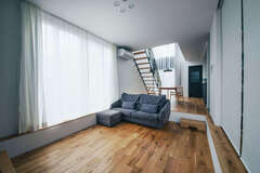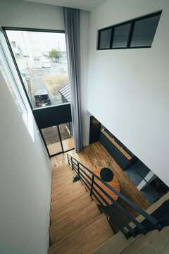 ご購入された土地は、大きく窓を取りたい南側に隣家が建っており、いかに室内に光を取り込むかが課題でした。ダイニングの吹抜けとダイナミックな“段窓”をご提案し、プライバシーを確保しつつ十分な採光を実現しました。