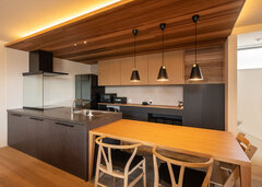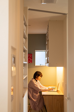 プランニングの際に重視したのは庭。奥さまの実家は3つの庭があるお寺。「そんな環境で育ったので、娘のためにも小さくても絶対に庭が欲しかったんです」と話す。また、住職の父親は教員でもあり、家には檀家さんや教え子たちがいつも賑やかに集っていたという。実は奥さまも教員。子どもを連れたママ友に加え、教え子たちも気軽に集う家にしたいという希望もあった。こうして完成したのは、奥さまの好きなものだけを集めた、子どもを見守る大人の住まいだ。カフェ風のダイニングキッチンには、憧れだった北欧家具を。広々としたリビングには座り心地のよさに一目惚れしたソファが。「これを機に、いい物を長く大切に使いたい気持ちも芽生えて」と、暮らしに対する意識も変わった。ご主人ともに家で持ち帰り仕事をすることもあるが、仕事道具を広げるのは、書斎や家事室だけ。そんなルールも、家族の癒やしの時間と空間を大切にする、ちょっとした秘訣なのかもしれない。