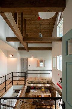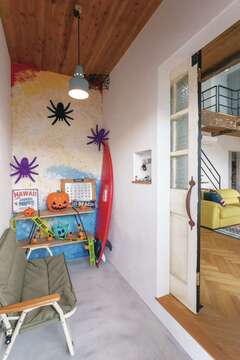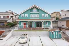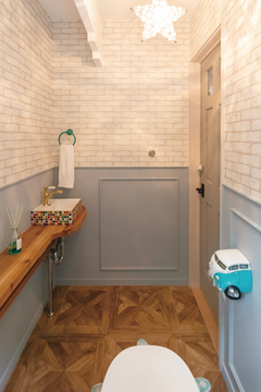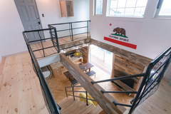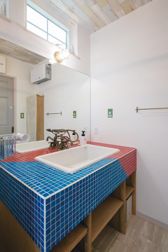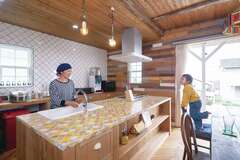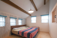 人とは違うオンリーワンの家を建てたかったSさん。そこで女性設計士の上総さんが提案したのが、外観も室内も自然素材にこだわった、本物のアメリカンサーファーズハウスだ。ダイナミックな吹抜けのLDKは、ヘリンボーンの床とエイジング加工した梁にアンティーク家具が映える『富士ホームズデザイン』らしい絵になる空間。全開口の窓を開けると、アメリカ映画のようなカバードポーチとつながり、庭と室内の一体感が心地いい。シャビーシックなインテリアの主役は奥さまお気に入りのオリジナルオーダーキッチンで、使い勝手も抜群。赤い玄関ドアや星条旗を思わせる洗面台、遊びゴコロ満載のトイレやボルダリングなど、独特の美意識でまとめられたデザインと、効率の良い家事動線や適量適所の収納といった子育て生活のぬくもりも加わった木の家はホッとする。「言葉でうまく伝えきれないイメージを雑談の中から汲み取って、理想以上のカタチにしてくれた上総さんに感謝しています。この家に住むようになってから、ますますアメリカが好きになりました。まだ一度も行ったことないんですけどね(笑)」と満足そうに語るご主人。アウトドア大好き家族のライフスタイルにぴったり合うアメリカンサーファーズハウスは、長く住むほど味わいを増し、愛着も湧いてくる。