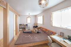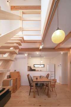 「デザイン住宅や広すぎるリビングなどにはもともと興味がなく、シンプルなデザインで新しいのにどこか懐かしい木の家が大好き」と奥さま。1階には、明るく広々とした木のぬくもりあふれるLDKを配置。奥にはデザインや角度も妥協せず、こだわりぬいて完成した「ヒノキ造りの階段」が2階へと続く。T邸のシンボルであり宝物だ。現しにした静岡県産の富士ヒノキや天竜杉もポイント。木の家ならではの高い調湿性能で家の中がいつも快適に保たれ、やさしい木の香りは日常に癒しをもたらしてくれる。経年美が増した愛用の家具たちも、奥さまの手でセンス良く置かれ、新しい家に溶け込んだ。土地購入から約1年10か月、丁寧に暮らしを紡ぐTさん一家に“ちょうど”の心地よい我が家が完成した。