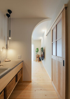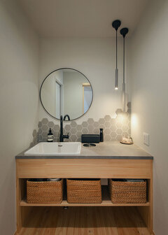「2棟連続で『フジモク』さんで建てた感覚です」。そういって奥さまが笑うのは、実家の計画中に結婚が決まり、そのまま新居も依頼したから。雰囲気が好みだったこと、そして思いを受け止めてくれた小池さんの姿に、他の選択肢は考えられなかったという。切妻屋根が印象的なI邸には、1棟目を経ての経験と要望が詰まっている。玄関右手には5畳のアウトドアストッカー。スロップシンクを備え、壁にはアレンジ可能なOSBボードを採用した。造作洗面台はLDKの入口に。帰宅動線上というだけでなく、トイレも近く、利用の場面は多くなる。大きな吹き抜けのLDKに漂うのは、富士ヒノキの香りと北欧風の家具が似合うナチュラル感。洗濯完結のランドリールームや愛犬アルくんの世話をするための台など、暮らしやすさも溶け込む。強い主張はないのに、しっかり個性があって、I夫妻ならではの日常が形に。“家づくりで大切なこと”を教えてくれるような一棟だ。