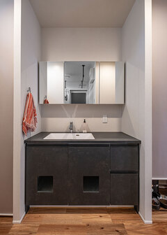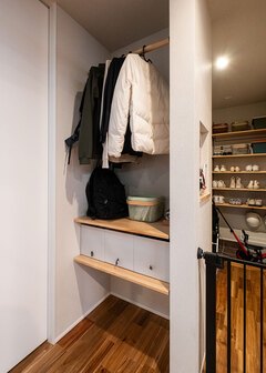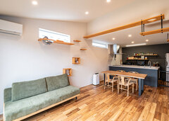 「猫ちゃんと楽しく暮らしたい」という想いから始まった家づくり。キャットウォークやステップなどを造作し、ご家族が理想の暮らしを送れる家を実現しました。また、クルマ好きのご主人のために、趣味を楽しめる場所としてガレージもご用意しました。