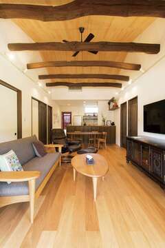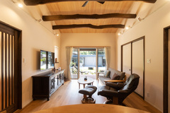 広大な敷地に、別荘のような和モダンスタイルの平屋を建てたSさん。高級旅館のような玄関を入ると、高い天井のLDK、夫婦の各部屋、和室、デッキへとつながり、将来、もし車椅子の生活になっても快適に暮らせるように設計されている。夫婦の旧宅への愛着が深いことを強く感じた矢吹社長は、梁や建具など、使える部材の一部を積極的に再利用。朝日が昇る光景や、竹林からこぼれる夜の月明かりなどを家の中から眺めながら、心にゆとりを持って暮らせるようになったそうだ。