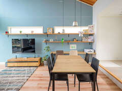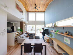 富士山が見える贅沢なロケーションにマイホームを建てたMさん。外観は和とモダンがバランスよく融合したデザインで、アイボリー系の外壁を黒いカーポートが引き締めている。玄関を入ると、鮮やかなブルーのクロスが曲線美を描き、来訪者に強烈なインパクトを与える。1階の奥には防音仕様の音楽室を設け、ご主人が趣味のギターやドラムを存分に楽しむ。プライバシーを確保し、富士山の眺望を楽しみながら暮らせるよう、LDKと水回りは2階にレイアウトした。木の温もりを感じるリビングは、勾配天井を活かした開放感あふれる空間で、壁一面に貼ったスカイブルーのクロスがアクセントに。キッチンから目が届く位置にスタディコーナーを設け、親子のコミュニケーションもとりやすい。家全体につながりを持たせつつ、家族それぞれの居場所がある家にMさん夫妻はとても満足しているそう。