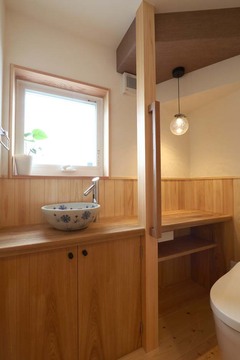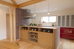 自宅でピアノ教室をしているUさん。レッスン室に加え、夫婦と娘さん3人のプライベートスペースも十分に確保すると、共有スペースのリビングやダイニングに使う空間は若干狭くなってしまう。そこで、ウッドデッキや吹き抜けで解放感を出し、大きな円卓でLDKを自然につなぐように工夫を施し、実際の広さ以上にゆとりを感じられる空間に仕上げた。天井には存在感のある太鼓梁を設けてアクセントに。見上げた時に自然と目に入る位置に配され、空間に柔らかみを添えている。また、家全体に優しい雰囲気が漂う木の空間の中で目を引くのは、キッチンとカップボードのビビッドな赤。ご主人の好きな赤を差し色に使うことで、おしゃれ感をアップ。娘さんも一緒に料理ができるよう配慮した大きめキッチンもポイントだ。