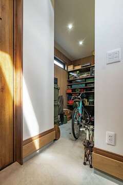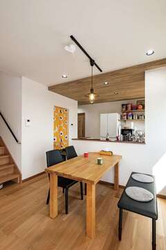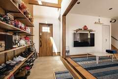 「木を感じる家がいい」「大きな土間がほしい」。イエタテ相談カウンターにて、そんな要望にマッチする会社の紹介を受けたKさん夫妻。『ぽっくハウス』を選んだのは、イメージピッタリのナチュラル感と自由度・性能・コストのバランス。元大工で、提案の引き出しの多い鈴木さんの親身さも決め手になった。玄関ドアを開ければ、誰もが驚きの声を上げるだろう吹き抜けの土間スペース。キャンプ用品のほか音楽やアメコミなど趣味のグッズがにぎやかに並ぶ空間は、そのままLDKにつながり、どこにいても声や気配が届く。キッチン横のパントリー、コンパクトな洗濯動線など便利さもしっかりプラス。“好きなもの”と“暮らしやすさ”に囲まれ、毎日が明るくなる一棟が完成した。