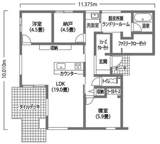 LDKは、ダイニングスペースをキッチン横付けに配置したL字型に。ダイニングからはタイルデッキに続く。どちらもの空間も充分な採光で、明るく広がりを感じる