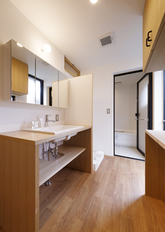 Sさん夫妻が地域型住宅グリーン化事業に参加する会社からパートナーを探したのは、補助金を受け取れることに加え、省エネ性や耐震性に優れる家を建てることができるから。施工例が好きな建築家の作品と重なった『灯建築舎』の事務所を訪れ、“建ててくれる人”の感性に触れたことが決め手に。洗練とナチュラル感が調和する空間センスが目を引くが、望んだのは以前の家に不足していた明るさと心地よさ。確かな意匠性を感じさせる吹き抜けが光を、太陽熱を活用する「びおソーラー」があたたかな空気を、広範囲に届けている。近隣に大きな公園がある立地を活かすため、同社が重要視したのは窓。座ったとき、立ったとき、料理の時間も、読書の合間も、美しい借景へと視線が伸び、けれども外からは見えすぎないよう計画された。家族同士、空間同士だけでなく、家と周囲の距離感を適切にすることで、心地よさはずっと大きくなる。そんなことを教えてくれる一棟だ。