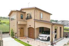 ご主人こだわりのビルトインガレージ付きの家です。外観から室内の壁や造作まで、アールの曲線で仕上げました。小上がりの畳下など収納も豊富ですっきりと暮らされています。