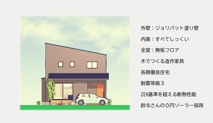 耐震や断熱などの基本性能を確保。無垢やしっくいなどの本物素材を使用し、収納や家事動線にもこだわっています。