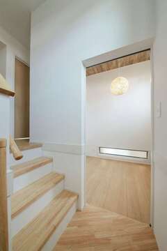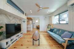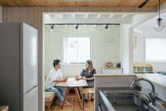 近くの店が目印にする三角屋根の外観も、サーフスタイルと無垢のナチュラル感が融合する室内も、Mさん一家によく合った住まい。それは「わがままを一番聞いてもらえそう!」と直感した『ハートホーム』に、細部のイメージまでを伝え切ることができたから。利便性も同様で、帰宅したご主人が浴室に直行できる2WAY動線、キッチンを中心にダイニング、パントリー、水回りを結ぶ一直線のレイアウトなど、日々の負担を減らす工夫まで形に。特にM邸らしいのは、上が客間兼フリースペース、下はご主人の隠れ家としたスキップ構造。暮らしにゆとりと楽しさをもたらしながら、将来の変化も柔軟に受け止める。他社では無理だったとご主人が語る費用面の満足も、笑顔の理由だ。