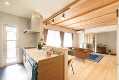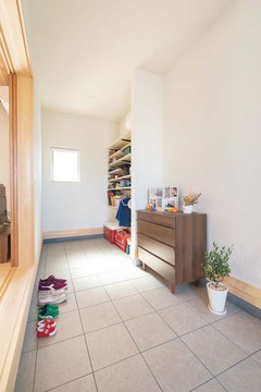 2人目を授かったことを知り、動きはじめたK夫妻の家づくり。『福工房』を選んだのには、3つの理由があったそう。まずはCMで印象に残った土間のある暮らしに憧れて。木をふんだんに使うことも、夫婦共通の希望。そして何より、好きな雰囲気や叶えたい暮らし方を、担当の殿村さんにしっかり理解してもらえたことが一番の決め手だった。玄関を入ると、念願の大きな土間。ヒノキと塗り壁に包まれたやさしい空間も、自然なつながりを実感する大らかな間取りも、それから画像で雰囲気を伝えたカフェ風のキッチンも、すべてイメージどおりの仕上がりだ。家事室や2階の室内物干しスペースも、間取りの工夫でしっかり確保。女性プランナーならではの提案により高められた暮らし勝手のよさも、「頼んでよかった!」という思いを大きくしている。