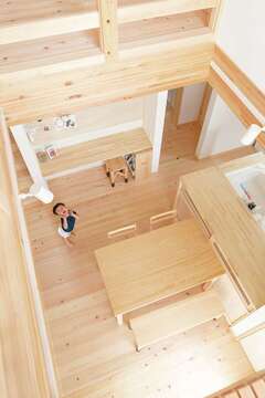 Eさん夫妻が『福工房』を選んだ最大の理由は、お子さまが一番元気に走り回った展示場だったから。帰りの道中、夢が具体的になっていった。玄関を開けると大きな土間と開放的なLDK。畳コーナーにいても、2階のファミリースペースにいても、キッチンまで声が届くからママも安心だ。おしゃれで便利な脱衣室。雰囲気にピッタリの手づくり家具。そしてお店のようなウォークイン。同社の展示場を〝制覇〟した成果に、自分たちらしさが加えられた。「息子のぜん息もよくなったみたい」と笑顔の奥さま。もうすぐ家族が増えるEさん一家だが、ヒノキと塗り壁に包まれた健やかな暮らしは、いつまでも続いていきそうだ。