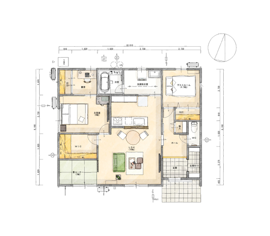 LDKや主寝室とゲストルームを離すことで気を使わずに過ごしていただけるようにしました。