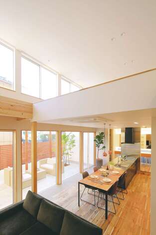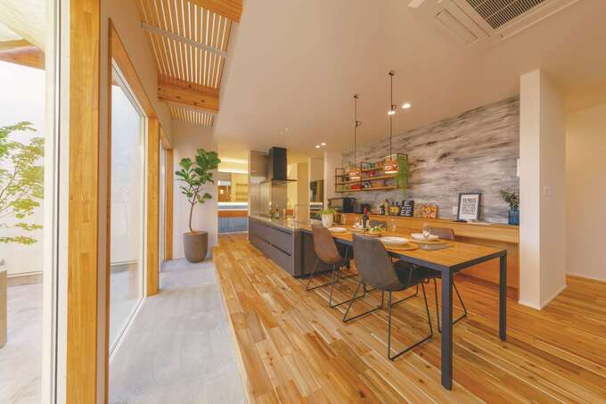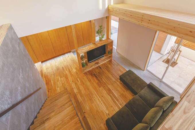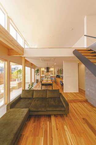 以前はマンションの4階で暮らしていたというUさん。戸建て住宅では、子どもたちに自然に親しむ暮らしをして欲しいと、外と繋がる家にしたかったそう。そんな漠然としたイメージを形にしてもらうために選んだのが、『住家』が建築家とつくる「design casa」だ。伝えた希望は、家の中に外の風景を取り込み、家族と過ごす時間を大切にしたい。それだけ。見事なマッチングにより、ファーストプランはUさんが想像する以上に理想の暮らしが具現化されていた。リビングの大きな窓から続くテラスは、自然の光や風、植栽による季節感を家の中にもたらす。また、LDKを取り囲むように配した土間は家の中にありながら、外へと誘うアプローチにもなる。建築家に依頼する家は予算オーバーするのではという不安は、事前のFP診断で解消。素材も建築家指定ではなく、普段『住家』が標準仕様として使っている無垢材や自然素材クロスなど。設計のプロ・建築のプロとともに三位一体で、憧れの我が家をつくりあげた。