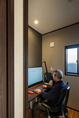ご主人の書斎は掘りごたつ式で、おこもり感抜群。愛犬ロンくんのスペースには専用の出入口も用意された