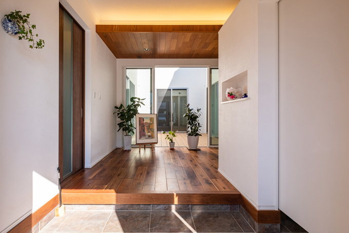 玄関に足を踏み入れると正面の大きな開口に中庭が広がり、思わず声が出るほどの開放感。右手は使い勝手のいい土間収納。子世帯入口のドアはマットなブラックがお気に入り