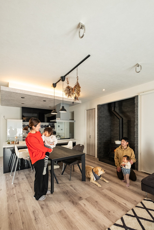 SNSを参考に奥さまのセンスを取り入れた子世帯のLDK。間接照明を設えた下がり天井が、スタイリッシュな空間に落ち着きを添えている。ハンモック用の金具も用意