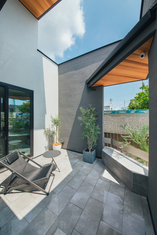 ポーチとテラスを一体化させることで、空間に自然な広がりを演出。南面を完全に閉じず、少し視線を抜くことで、外とのつながりや開放感を感じられる設計にしています。