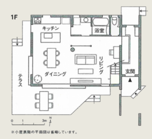 安心と快適、デザイン性を兼ね備えた「重量木骨の家」。LDKに一歩足を踏み入れると、思わず感嘆の声をあげたくなるほどの大空間が広がる。大きな開口部でウッドデッキを室内の延長線上のように使う設計で、延床34坪とは思えない広がりを生んだ。また、間仕切り壁や設備は自由に移動でき、ライフスタイルに合わせ間取りの変更も可能。そして耐震等級は最高ランク。「SE構法」の実力と同社の提案力を、ぜひその目で確かめて。