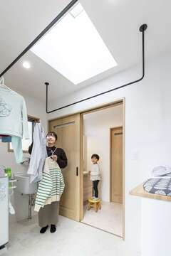 脱衣室・洗面室・洗濯室を完全に分け、1か所で洗濯を完結できる。すぐ近くにファミリークローゼットを設け、家族それぞれが自分で整理整頓する習慣が身についた。リビング内に小上がりのキッズスペースをしつらえ、勉強したり、遊んだり、子どもたち専用の空間に。対面キッチンは奥さまのこだわりで、かわいいカフェスタイルに仕上げた。