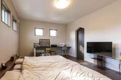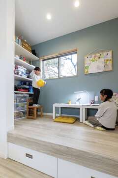 2つの子ども部屋はあえて広くせず、寝るためだけの空間に。広い納戸には、出し入れの頻度が少ないシーズンオフ家電や節句人形などを保管。主寝室内にご主人の趣味部屋を確保し、一人の時間を楽しむ。