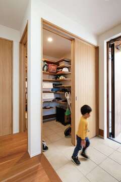 玄関の土間収納に可動棚をつけ、キャンプ、BBQなどのアウトドア用品置き場に子ども部屋