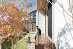 リビングの掃き出し窓から縁台に出られる。ダイニングのピクチャーウィンドウの前にはヤマボウシを植え、秋にはキッチンからも紅葉を楽しめたそうリビング