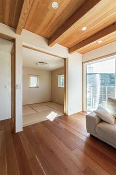 秋は縁台に座って紅葉も楽しめる。庭木はヤマボウシ、ヒメシャラ、イロハモミジなど1本1本選び、窓からの眺めも考えて植樹した白いガルバリウムとレッドシダーが調和する外観は、シンプルでありながら温かみを感じさせるデザインである。リビングダイニングはブラックチェリーの床とツガ板張りの天井が居心地の良さを演出し、子どもが安心して遊べるよう配慮された空間である。テレビは壁掛け仕様にし、配線は壁内に隠すことで、すっきりとした印象を実現。庭にはヤマボウシやヒメシャラ、イロハモミジを植え、窓から美しい紅葉が楽しめる。和室からの見事なカエデの紅葉も見逃せない。アウトドア用品を収納できる可動棚付きの玄関土間も便利である。
