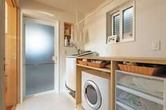 脱衣室の棚は衣類乾燥機や収納ケースの大きさを指定して造作。上でアイロンがけもできるようにコンセントを配置した玄関ホール