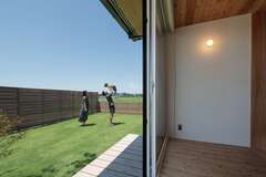 「子どもが大きくなったら庭で一緒にサッカーをしたい」とご主人。窓を開け放てば、昔の日本家屋のような縁側の心地よさを実感できる洗面スペース