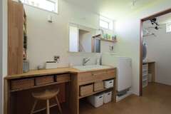 収納するモノに合わせて棚のサイズを細かく設計した造作洗面。手前は奥さまのメイクスペースに。奥の脱衣室には「乾太くん」に合わせた作業カウンターと収納もシアタールーム
