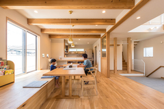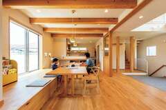 家の中の家具や建具はすべて木の温もりを感じる造作で。縁の面取に職人の優しさを感じるこの二世帯住宅は、家族の生活スタイルを考慮し、プライバシーを重視した設計である。通りに面する開口部を少なくして、外部からの視線を遮っている。北側に位置する広い玄関土間は、大きな窓で明るく、子どもの遊び場としても活用される。ダイニングキッチンは、購入を決めていたダイニングテーブルのサイズに合わせて設計し、窓辺にはベンチシートも兼ねた小上がりが設けられている。畳敷きのリビングは、北欧テイストと和モダンが調和しており、落ち着きある空間を提供する。3階には開放感のあるフリースペースが広がり、子ども部屋は陽光をたっぷり取り入れる設計である。家全体に木の温もりが感じられる造作家具が施され、職人の技が細部にまで行き届いている。完全自由設計のこの住まいは、家族にとって理想的な空間となっている。