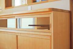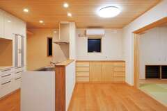 1階にある親世帯のLDKは、キッチンから和室リビングへの動線がスムーズ。目的を明確にした収納を設けているのですっきりとした暮らしが可能に収納