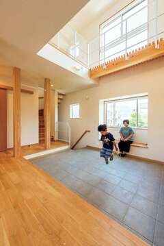 広い土間は、時として子どもの遊び場にも。生活の中で玄関を身近に感じられるので、ちょっとした外出も楽しくなったそう。北側に位置しているが窓を大きく取っているため、明るい空間にダイニングキッチン