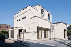 通りに面した開口部は少なくしてプライバシーに配慮。玄関は2つ設け、子世帯は直接2階に上がれる玄関土間